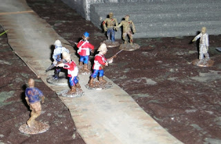 I decided to do something a little different and set a small group of my Colonial Brits against the walking dead. The rule set is THWs ATZ. I had a sneaking suspicion this was going to be a short game when I rolled 2 6s and 2 5s for the starting number of zombies. In a rural area that meant 12 zombies!